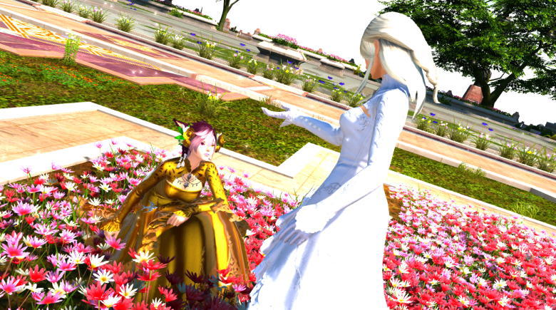 本当はあたしが、ペタン座りしてるうるたんの頬っぺたに手を差し伸べてる風にしたかったけど、座ってる相手にターゲットするとこちらも膝をつくエモートになっちゃうんですよね。いろいろ試してみたけど、これが一番絵になった。
