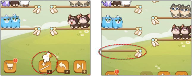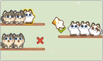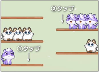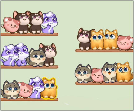 ただし、ひとつの棚に並べられるのは4匹まで。1マスしか空いてない棚に2匹以上を移動することはできませんし、同じ種類の猫がいない場所にも移動できません。