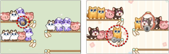 たまに、爆弾の回数内しか並べ替えできなかったり、鍵を持ってる猫を消さないとケージに入った子を移動できないといったステージも出てきます。