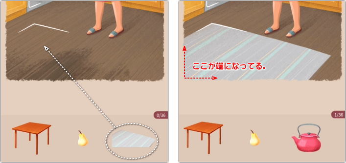 上の絵の場合は、テーブルだと上辺の角は合ってても脚の部分が絵をはみ出してしまう。でもカーペットらしいこのパーツなら絵の端に合ってる。まぁこのあたりはジグソーパズルと同じですね。