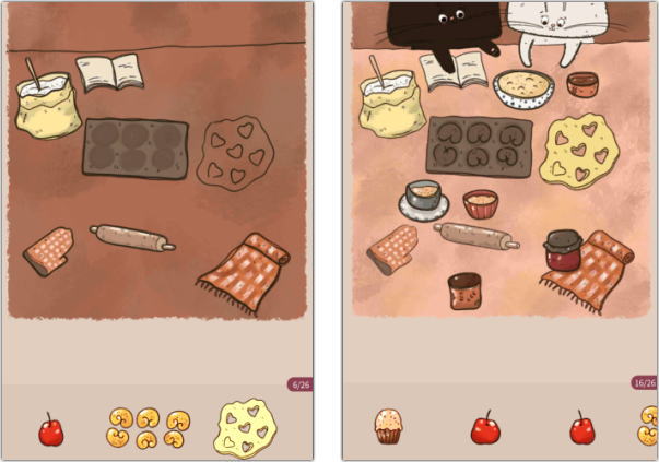 ただしジグソーパズルのように絵全体をピースで完成させるわけではなく、テーブルや椅子・小物、建物の柱や屋根や窓、木や枝や花といった各絵のパーツ毎に、枠線でヒント表示された指定の場所へ嵌め込んでいく……という方式のパズルですね。