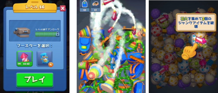 さらにステージが進むと、余分なアイテムを吹き飛ばしてくれる「花火」や、制限時間を伸ばしてくれる砂時計などのブーストアイテムも登場。ゲーム開始時に紛れてるこれらを先にタップしておくのがコツと言えるでしょうか。