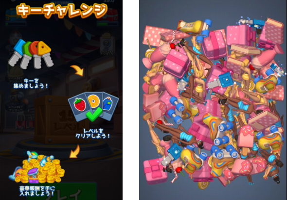 まぁようするに、アイテムの中に紛れてる「鍵」を一定数収集する毎にコインやプレイ回数、ブーストアイテムなどが貰えるってやつです。とくに深く考えなくても脳直で遊べるゲームですが、ステージによってはちょっと消し方にコツというか注意が必要な場合もありますね。