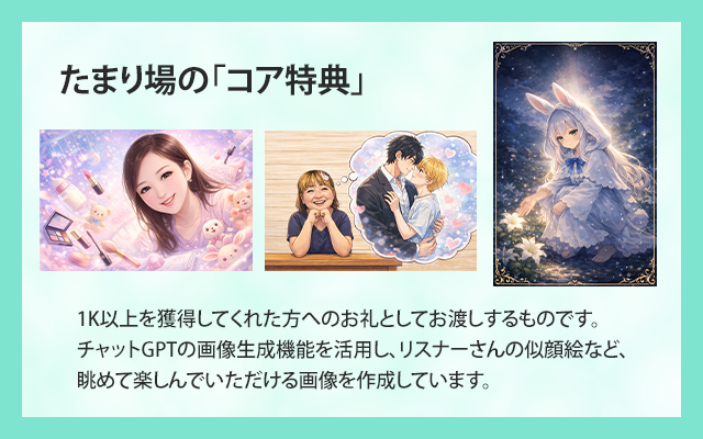 ポコチャの配信中に、1K以上の応援をいただき、コアファンになってくださった方へ、感謝の気持ちを込めて、生成AIを活用したオリジナルイラストを特典としてお渡ししています。